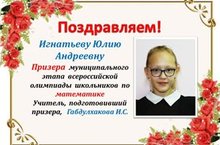 Игнатьева Ю.А., ученица 4 класса, стала призером муниципального этапа всероссийской олимпиады школьников по математике (учитель Габдулхакова И.С.) Поздравляем! Молодец! Желаем дальнейших успехов.