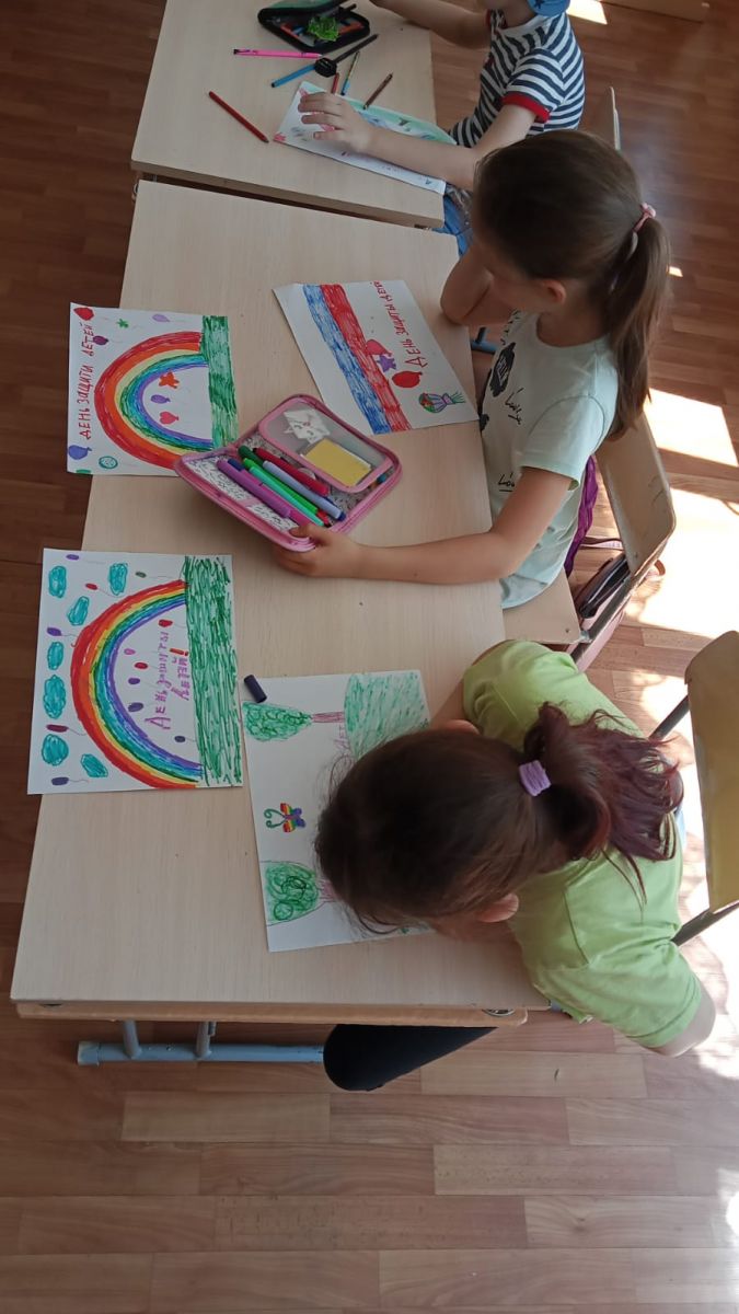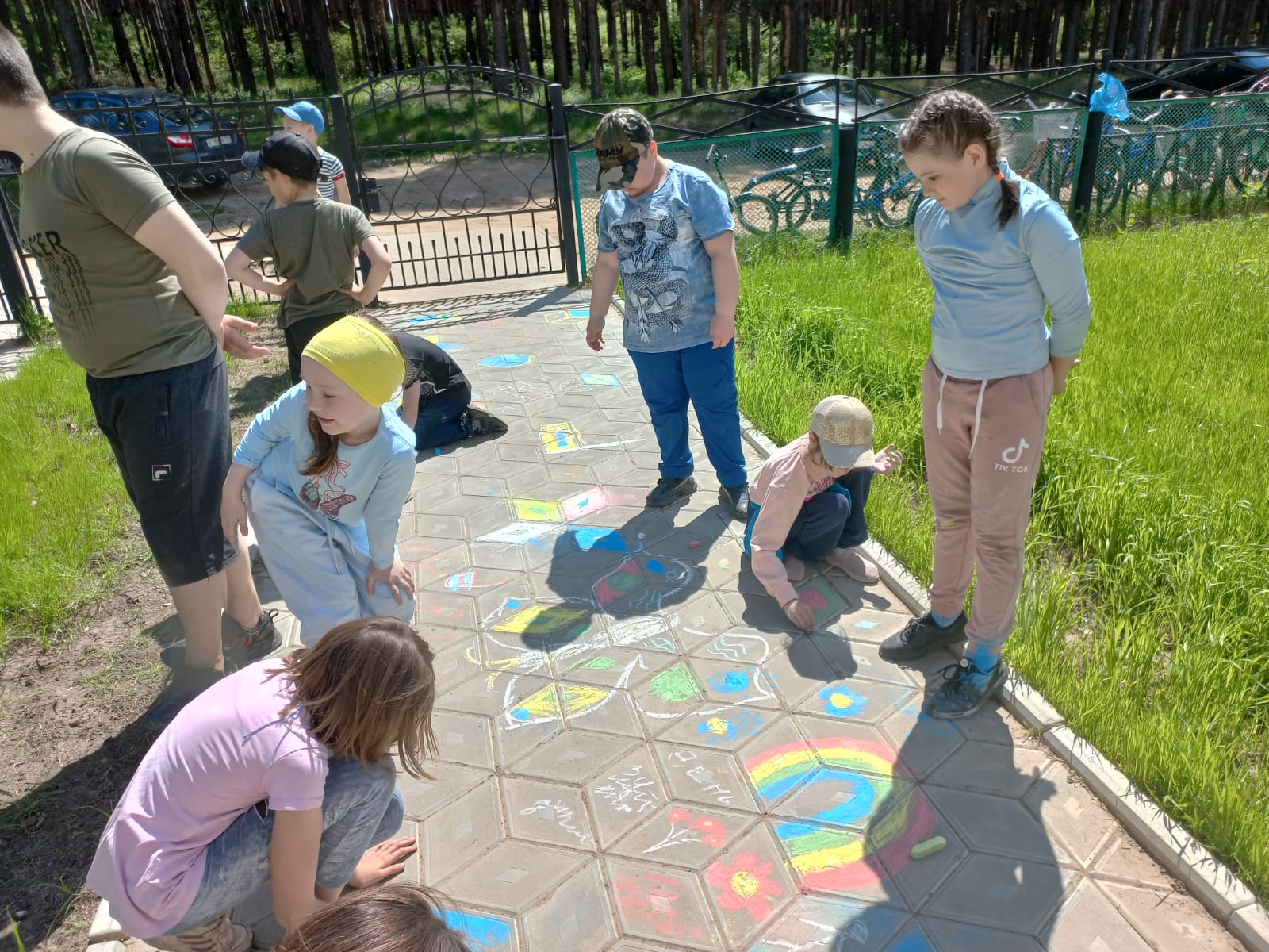 В школе прошла выставка рисунков ко Дню защиты детей. Дети рисовали на асфальте и бумаге.