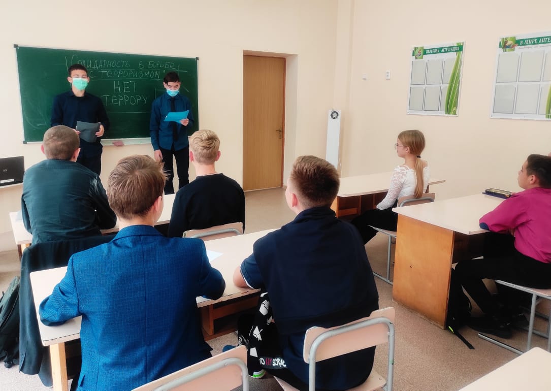 10 сентября учащиеся 9 класса посвятили классный час памятной дате - Дню солидарности в борьбе с терроризмом. Ребята подготовили доклады, о трагических событиях в истории современной России.