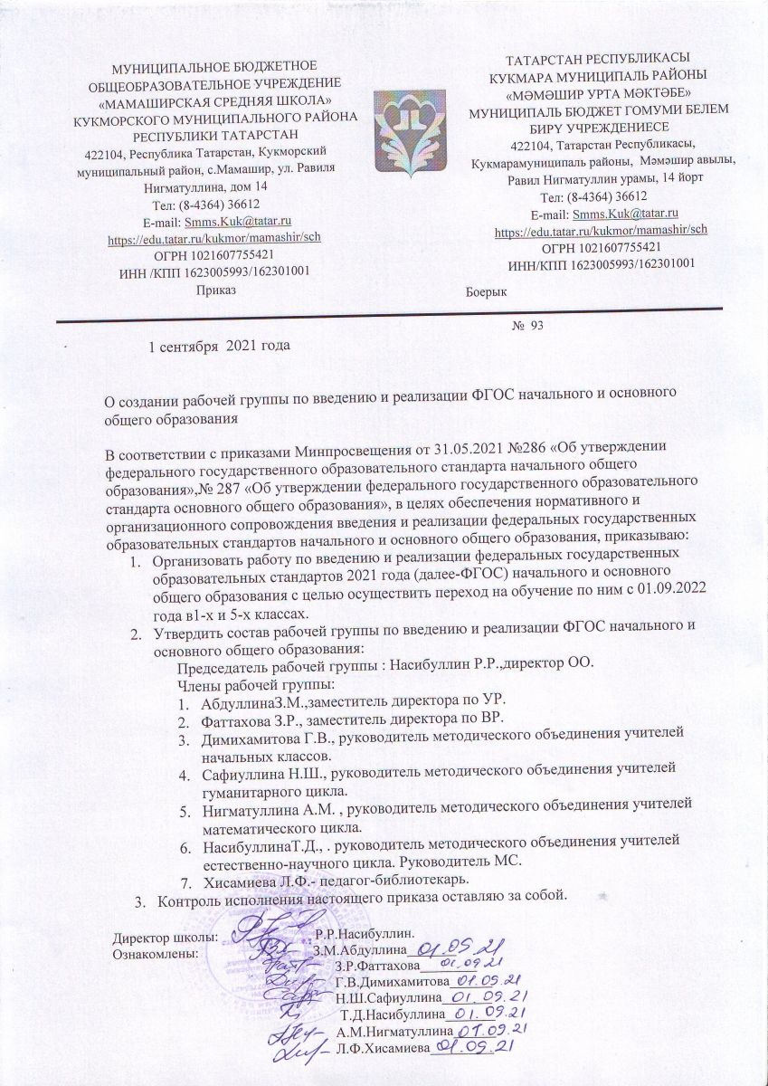 Состав рабочей группы по введению и реализации ФГОС начального и основного общего образования
