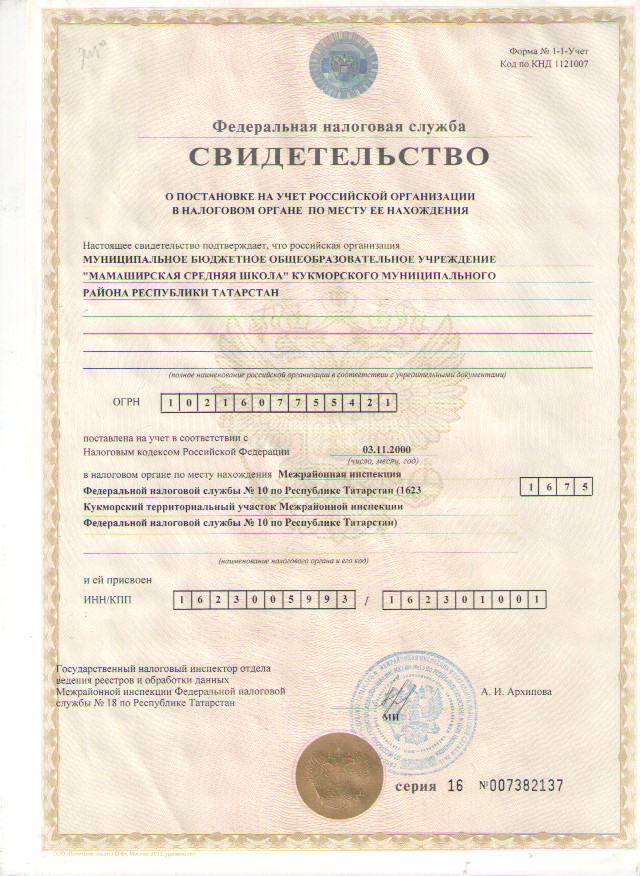 Свидетельство о постановке на учет российской организации в налоговом органе