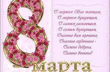 Дорогие наши Мамы, Бабушки! Сегодня день особый! Правда? Прекрасный праздник у весны! Сегодня День 8 МАРТА- Так пусть счастливой будешь ты! Весна! Как много в этом слове: Добра, любви и теплоты Пусть в ожидающей природе Тебе цветут ее цветы! Пусть в этот день 8 Марта- Уйдут тревоги и придут мечты 08.03.2015