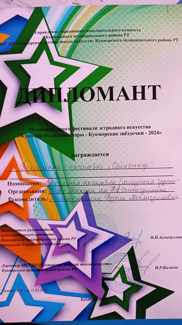 Итоги фестиваля "Кукмара йолдызчыклары - Кукморские звёздочки - 2024"! В группе младшего школьного возраста вокальный ансамбль "Сәйләнләр " (рук.Хамидуллина Г.М.) дипломантом (в номинации песни из м/ф) и дипломом III степени (в номинации татарской народной песни).