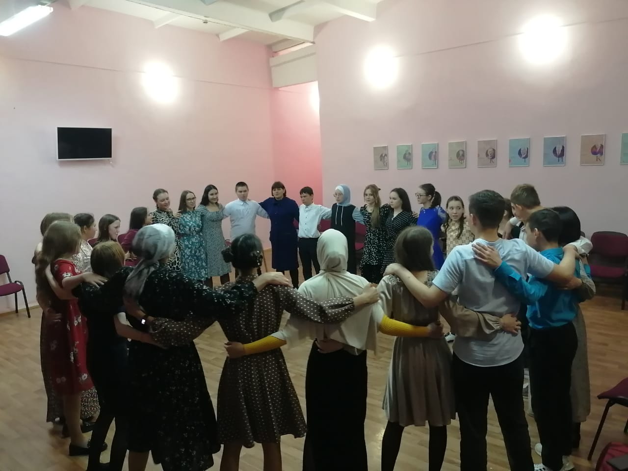 Сегодня для учащихся 7-11 классов в рамках недели родного языка была проведена "Вечерняя игра" с песнями и танцами. Дети с удовольствием играли в национальные татарские игры "Капкалы", "Чүпләмле", "Каешлы", "5,10,15", "Габдулла и Гульбану". Они с удовольствием участвовали в танцах на татарском языке, пении татарских песен.