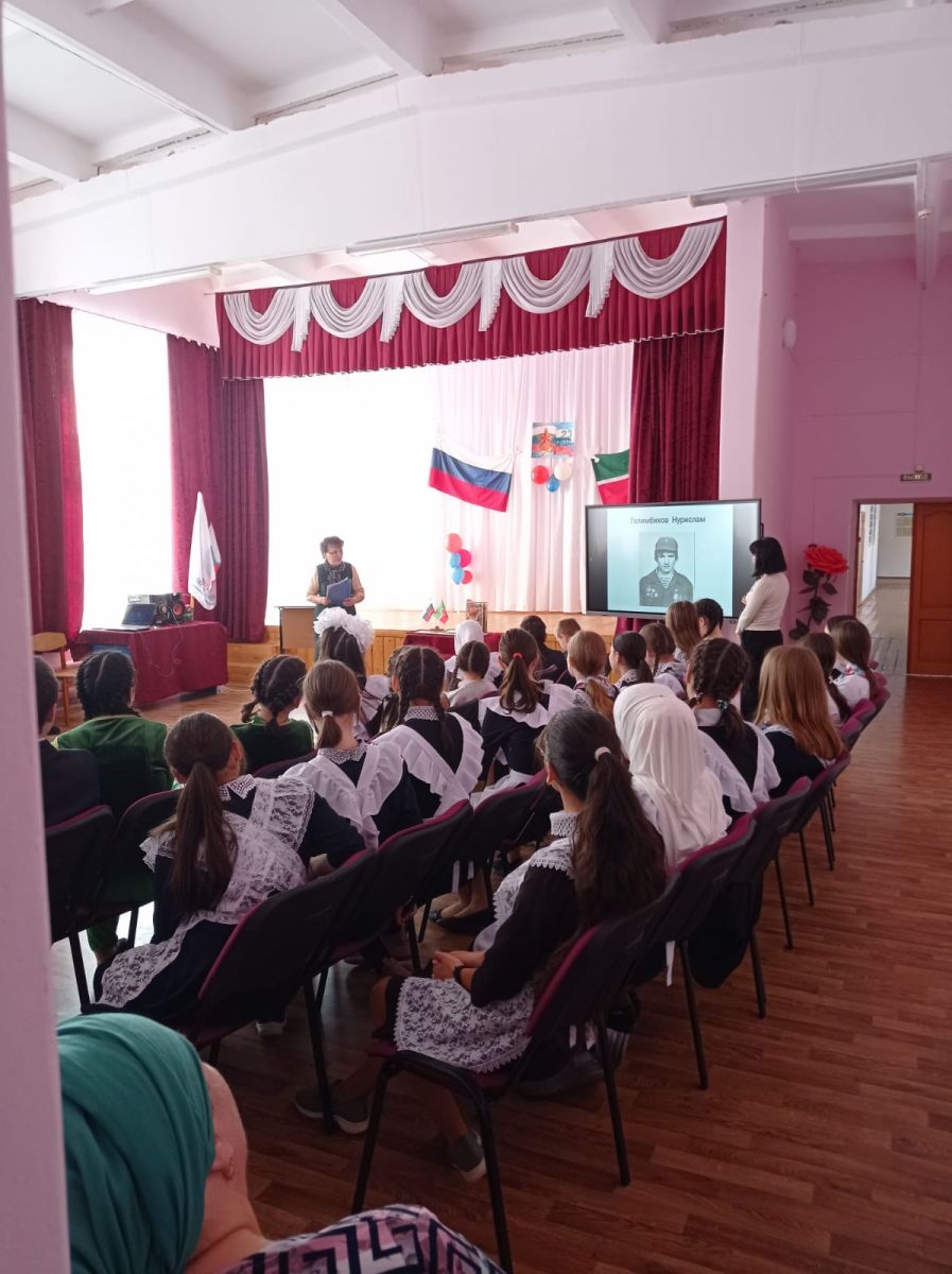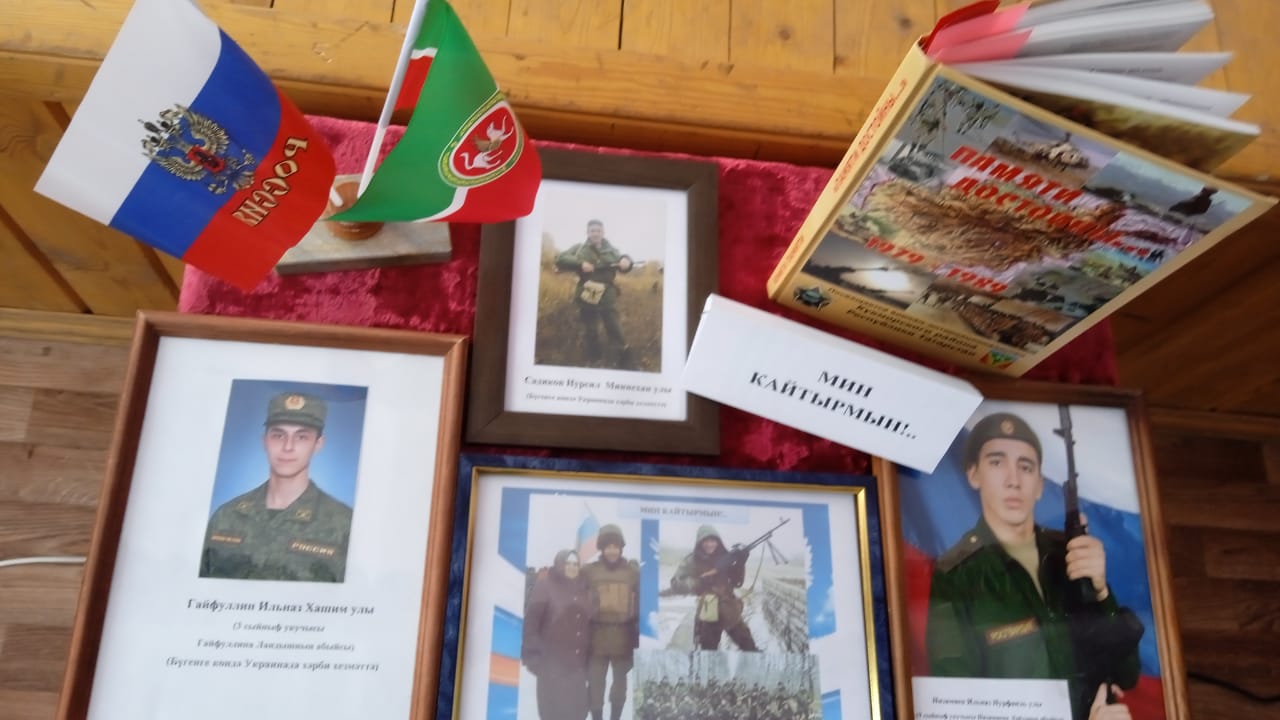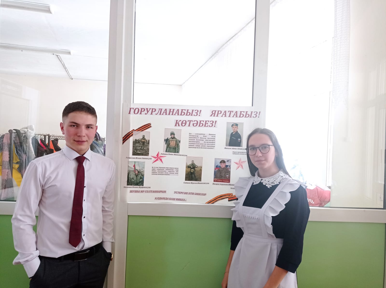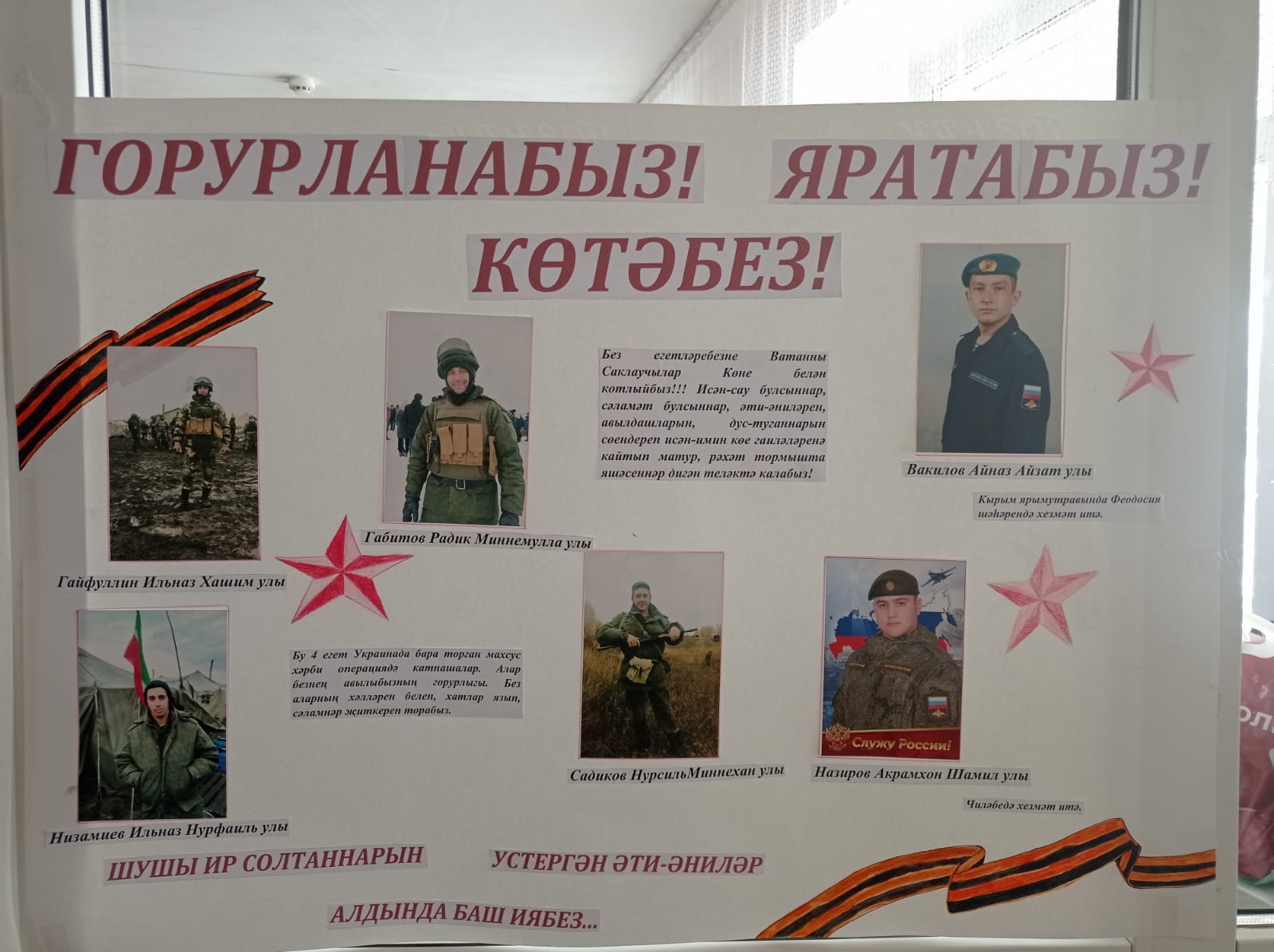 Махсус хәрби операциядә катнашучы егетләребезгә һәм бүгенге көндә хәрби бурычын үтәүче солдат егетләребезгә багышланган стенд - өлкән сыйныф укучыларының иҗади эше. Әлеге егетләрнең һәрберсе белән горурланабыз, аларның рух ныклыгы, сабырлыгы, батырлыклары алдында баш иябез! Илләр тыныч булып, әлеге егетләребезнең һәрберсен туган якларында, гаиләләрендә таза-сау килеш күрергә язсын!