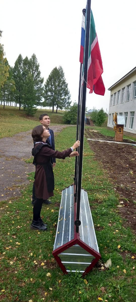 Бүген безнең мәктәп активистлары 9 сыйныф укучылары Гайнуллин Айзат һәм Юзмиева Зилия РФ һәм ТР Дәүләт флагларын күтәрделәр.