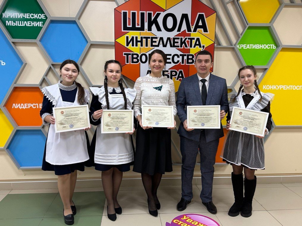 Чыңгыз Айтматовның 95 еллыгына багышланган Халыкара "Кыргызстан-Татарстан" телекүперен оештыруда һәм үткәрүдә керткән өлешебез өчен мәктәп директоры Миннемуллин И.М., тәрбия эшләре буенча директор урынбасары Хамидуллина Г.М., Туган төбәкне өйрәнү музее җитәкчесе Мухаметзянова А.М., 8нче сыйныф укучысы Гайнуллина Зәлинә, 9нчы сыйныф укучысы Рахимова Таңсылу, 10нчы сыйныф укучысы Сабитова Дилә рәхмәт хатлары белән бүләкләнделәр. Рәхмәт хаты Татарстан Республикасы Мәгариф һәм фән министры Һәдиуллин Илсур Гәрәй улы тарафыннан имзаланган. Рәхмәт хатларын Казан шәһәренең "Инженер үзәге - лицей" җитәкчеләре тапшырды.