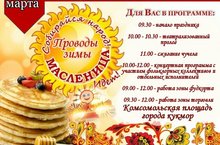 13 марта на Комсомольской площади состоится народное гуляние "Масленца. Проводы зимы". Вас ждет большая развлекательная программа и концерт. Добро пожаловать!