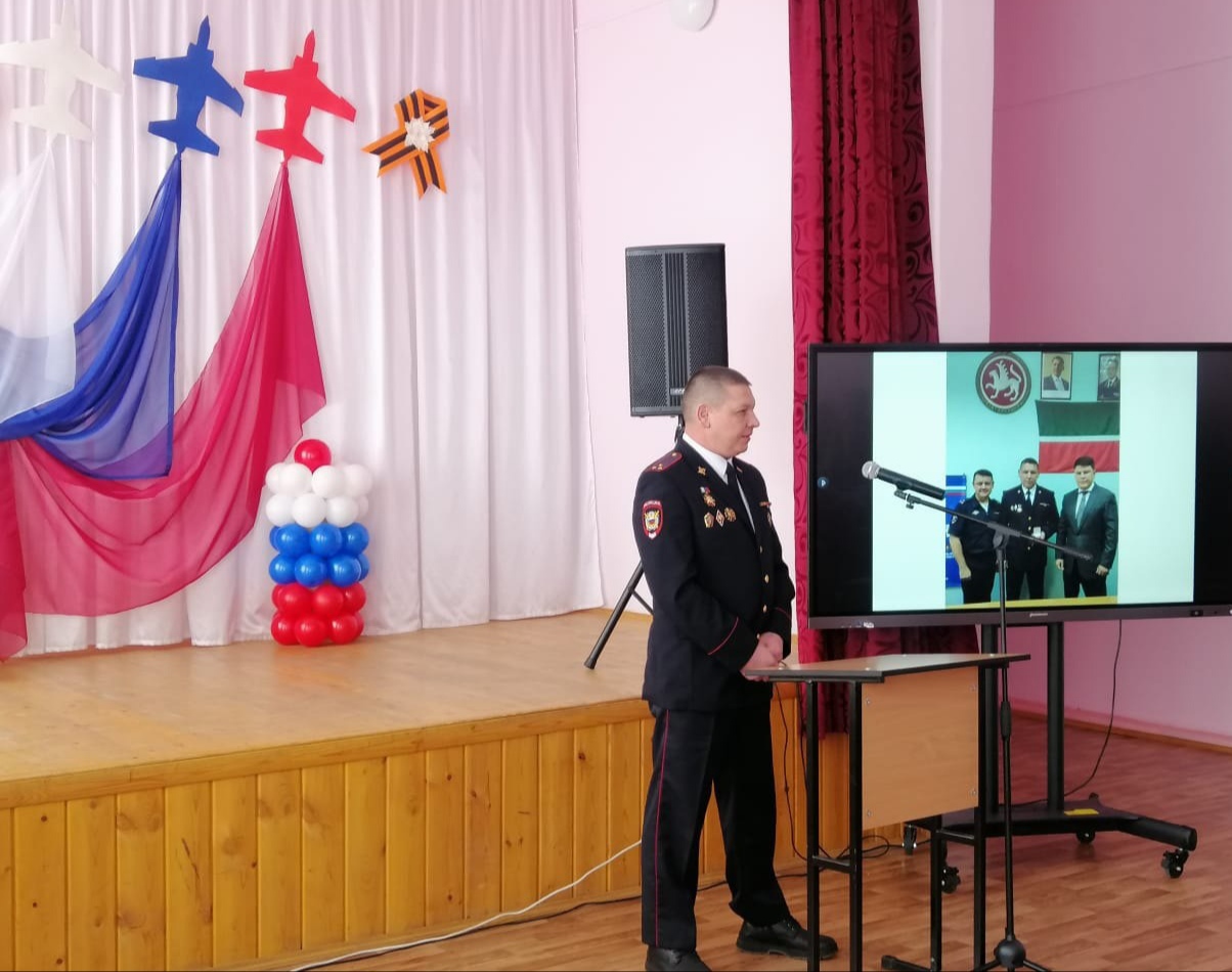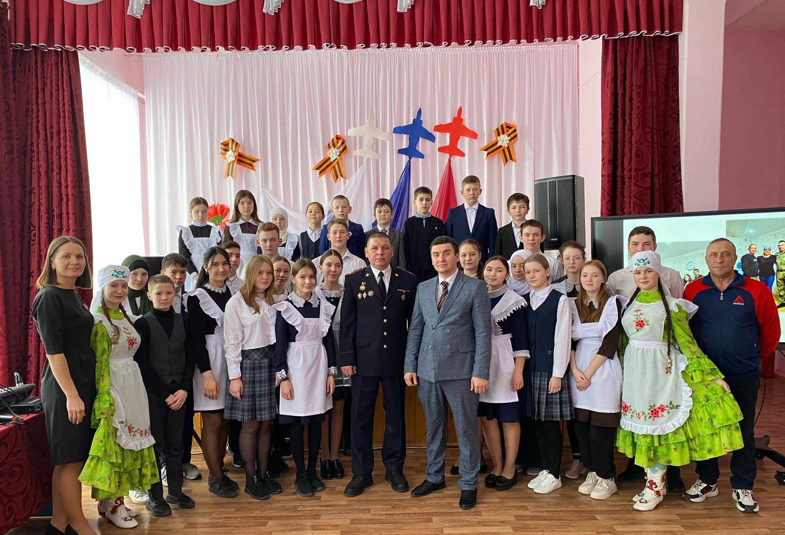Патриотическое воспитание учащихся - одна из главных задач сегодняшнего дня. Гораздо полезнее патриотическое воспитание показывать примером. С этой целью в нашу школу на встречу был приглашен сотрудник отдела внутренних дел г.Кукмор старший лейтенант полиции Сабиров Динар Минтимерович. Динар Минтимерович - наш выпускник, участник специальной военной операции, обладатель множества почетных нагрудных знаков, медалей. Встреча сопровождалась песнями и танцами, ни один вопрос не остался без ответа.