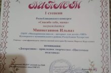 Параллельно с учебой наши ученики участвуют в различных конкурсах. В одной из Республиканских конкурсов под названием "Спасибо тебе, мама!", ученик 7 класса Миннегаянов Ильназ получил диплом первой степени". Он сделал "Подставку для цветов" вместе с учителем труда Нугмановым М.Н..