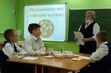 Учителем Галимуллиной М. Г. был проведен открытый урок на тему:" Использование яиц в питании человека". Его целью было: определить пользу яиц для организма человека, качество яиц по различным признакам, правильное питание. С помощью практической работы учащиеся проверили качество яиц.