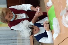 1 нче төркем тәрбиячесе Габдрахманова Гөлсинә кул эше сәгате вакытында балалар белән таба майлау өчен табигый материалдан кисточка ясады.