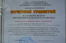 За значителный вклад в развитие спорта в районе завоевонное командное 3 место в первенстве республики Татарстан по корэш среди юношей 2002 - 2003 г.р., 2004 - 2005 г.р. на призы журнала "Сабантуй" в г. Елабуга Кангаров Андрей Александрович был нагрежден почетной грамотофй главы Кукморского муниципального района.