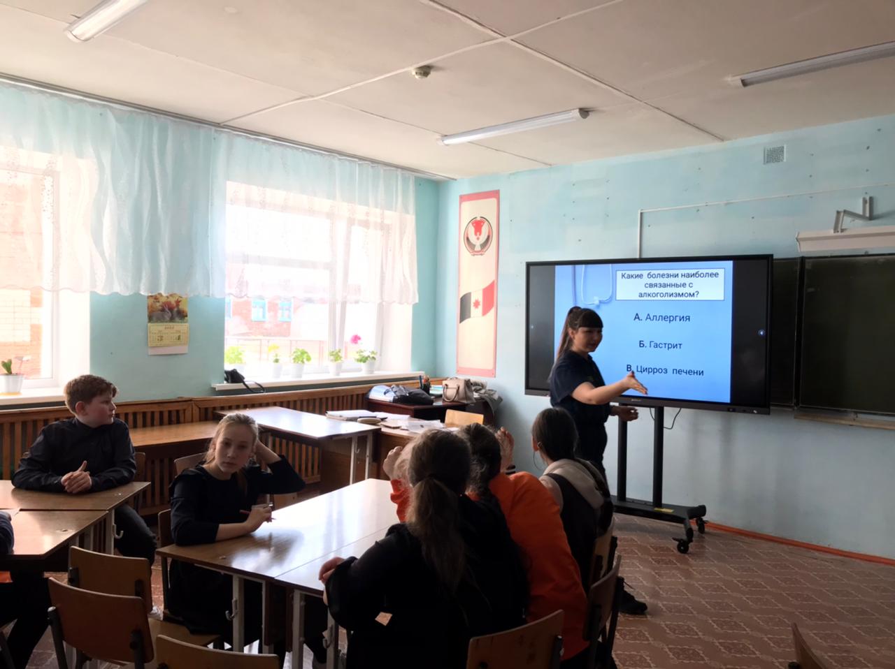 13 апреля в нашей школе прошла беседа на темы: «Вред алкоголя на организм человека», «Алкоголь и подросток» с сотрудницей ПДН Закировой К.А. Она провела беседа и викторины с заданиями для выроботки негативного отношения к употреблению алкоголя и алкоголь содержащих напитков. Беседа с наглядными материалами посодействовала выделить свойства алкоголя и его влияние на организм, в частности, на организм подростка./ 13 апрельдә безнең мәктәптә ПДН хезмәткәре К.А. Закирова белән «Кеше организмына алкогольнең зыяны», "Алкоголь һәм яшүсмер" дигән темаларга әңгәмә узды. Күрсәтмә материаллар белән сөйләшү алкогольнең үзлекләрен һәм аның организмга, аерым алганда, яшүсмер организмына йогынтысын аерып күрсәтергә ярдәм итте.