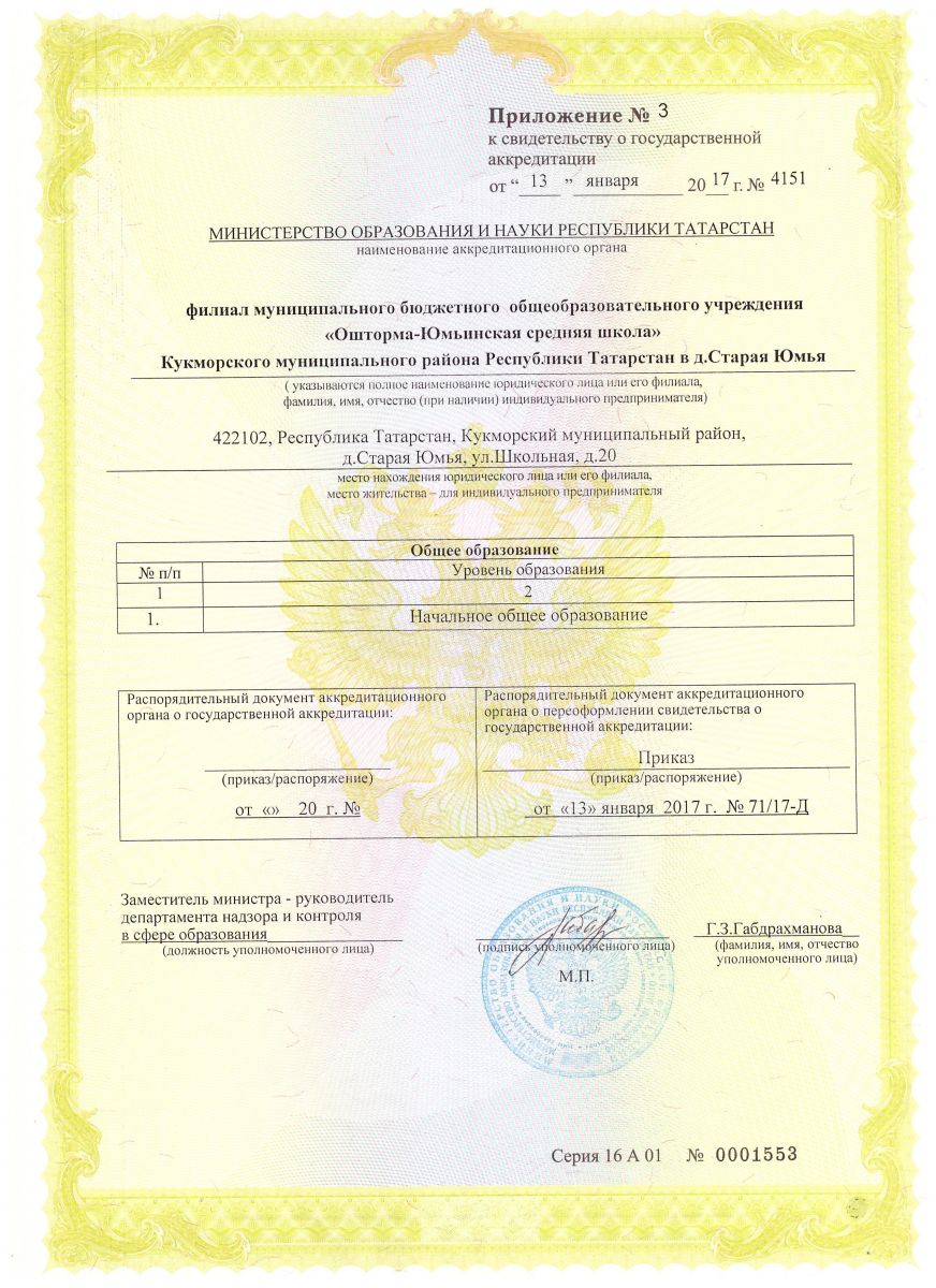 Филиал создан на неопределенный срок в целях реализации прав граждан на образование первой ступени (1-4 классы) по месту жительства - в деревне Старая Юмья Кукморского муниципального района РТ. Вид образовательной деятельности Филиала – начальное общее образование. Реализуется программы начального общего образования. Обучение - очное, в первую смену.