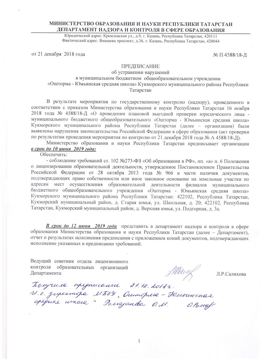 Предписание об устранении нарушений от 21 декабря 2018 года