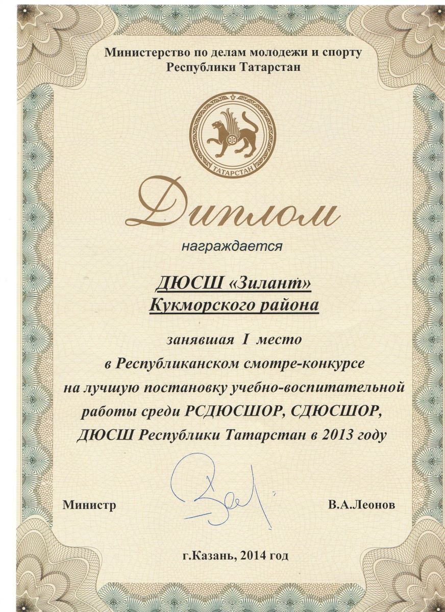 Диплом, Министерство по делам молодежи и спорту РТ, 1 место, 2014