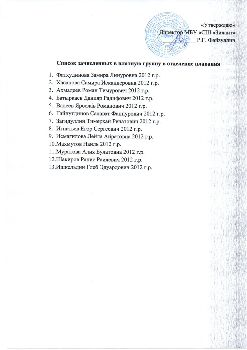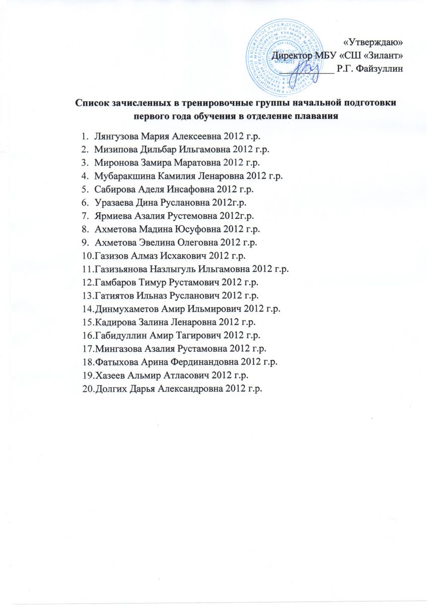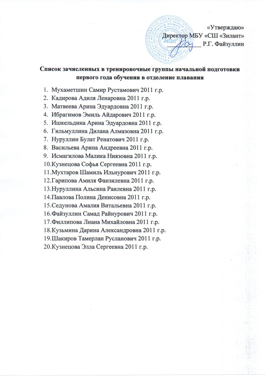 Список зачисленных в тренировочные группы начальной подготовки первого года обучения, 2012 г.р.