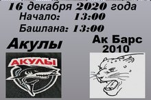 16 декабря 2020 года состоится матч Первенства Республики Татарстан по хоккею среди команд 2009г.р. между «Акулы» г.Кукмор и «Ак Барс-2010» г.Казань.
