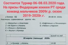 Состоится Турнир 06-08.03.2020года. на призы Федерации хоккея РТ среди команд мальчиков 2009г.р. сезон 2019-2020г.г.