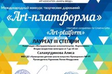 Поздравляем учащуюся музыкального отделения ДШИ Салахутдинову Алису, завоевавшую диплом Лауреата 3 степени в номинации “Фортепиано” Международного конкурса “Арт -платформа” (рук. Нурмеева Л.И.). Так же в номинации “Профи” преподаватель художественного отделения Загидуллин Р.И. был удостоен диплома Гран-При