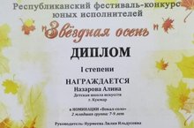 В Набережных Челнах состоялся Республиканский конкурс искусств «Звездная осень», где учащиеся музыкального отделения ДШИ завоевали почетные места: Назарова Алина- Лауреат 1 степени, Миннахметова Дина- Дипломант 1 степени (рук. Нурмеева Л.И.)