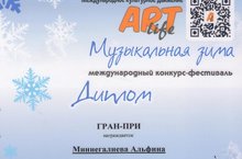 Учащаяся театрального отделения Миннегалиева Альфина приняла участие в Международном конкурсе- фестивале "Музыкальная зима", где стала обладателем диплома Гран- При (рук. Хабибуллина Д.Р.)