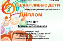 Кукмара балалар сәнгать мәктәбенең "Театр юных сорванцов" театр коллективы "Талантлы балалар" халыкара конкурс-фестивалендә Гран - прига лаек булды, жит. Хәбибуллина Д. Р.