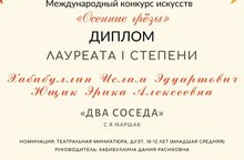Учащиеся театрального отделения Кукморской детской школы искусств приняли участие в Международном конкурсе искусств "Осенние грёзы", где, под руководством Хабибуллиной Дании Расиховны, дуэт Хабибуллина Ислама и Ющик Эрики завоевал диплом Лауреата 1 степени, Зарипова Зилия- Лауреат 2 степени