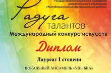 Вокальный ансамбль "Улыбка" Кукморской детской школы искусств ,под руководством Нурмеевой Л.И., принял участие в Международном конкурсе искусств "Радуга талантов", где завоевал диплом Лауреата 1 степени.