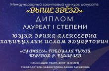 Учащиеся театрального отделения Ющик Эрика и Хабибуллин Ислам приняли участие в Международном грантовом конкурсе искусств "Выше звезд", где стали обладателями диплома Лауреата 1 степени (рук. Хабибуллина Дания Расиховна). Поздравляем победителей и желаем и дальнейших творческих успехов