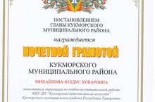 На отчетной коллегии работников образования при участии Главы Кукморского муниципального района С.Д. Димитриева и руководителя Исполнительного комитета Кукморского муниципального района А.Х. Гарифуллина, которая состоялась 29 января 2019 года, заместитель директора по УВР Кукморской детской школы искусств Михайлова Юлдус Зуфаровна была награждена Почетной Грамотой Главы Кукморского муниципального района "За значительные успехи в организации и совершенствании образовательного и воспитательного процессов, обеспечении единства обучения и воспитания, формировании интеллектуального, культурного и нравственного развития личности".