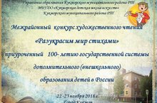 С целью обмена педагогическим опытом, расширения педагогического и художественного репертуара, установления творчеких контактов между учреждениями, 22-23 ноября 2018 года в городе Кукмор состоялся I межрайонный конкурс художетвенного чтения "Разукрасим мир стихами", приуроченный 100- летию государственной системы дополнительного (внешкольного) образования детей в России. Организаторами конкурса являлись Управление образования Кукморского муниципального района РТ и МБУДО "Кукморская детская школа искусств" Кукморского муниципального района. К участию в конкурсе были приглашены учащиеся дополнительных образовательных учреждений, общеобразовательных учреждлений, воспитанники ДОУ в возрасте от 6 до 15 лет. Всего в мероприятии приняло участие около 150 учащихся из Кукморского, Сабинского, Балтасинского, Арского, Мамадышского и Вятскополянского районов.