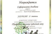 Поздравляем Сафаргалееву Альбину завоевавшую звание Лауреата II степени в межрайоном конкурсе игры по музыкально-теоретическим дисциплинам "Природы и музыки чудесный лик", в рамках года экологии в номинации "Музыкальная тропинка" 4-5 класс.