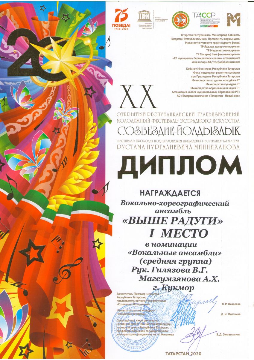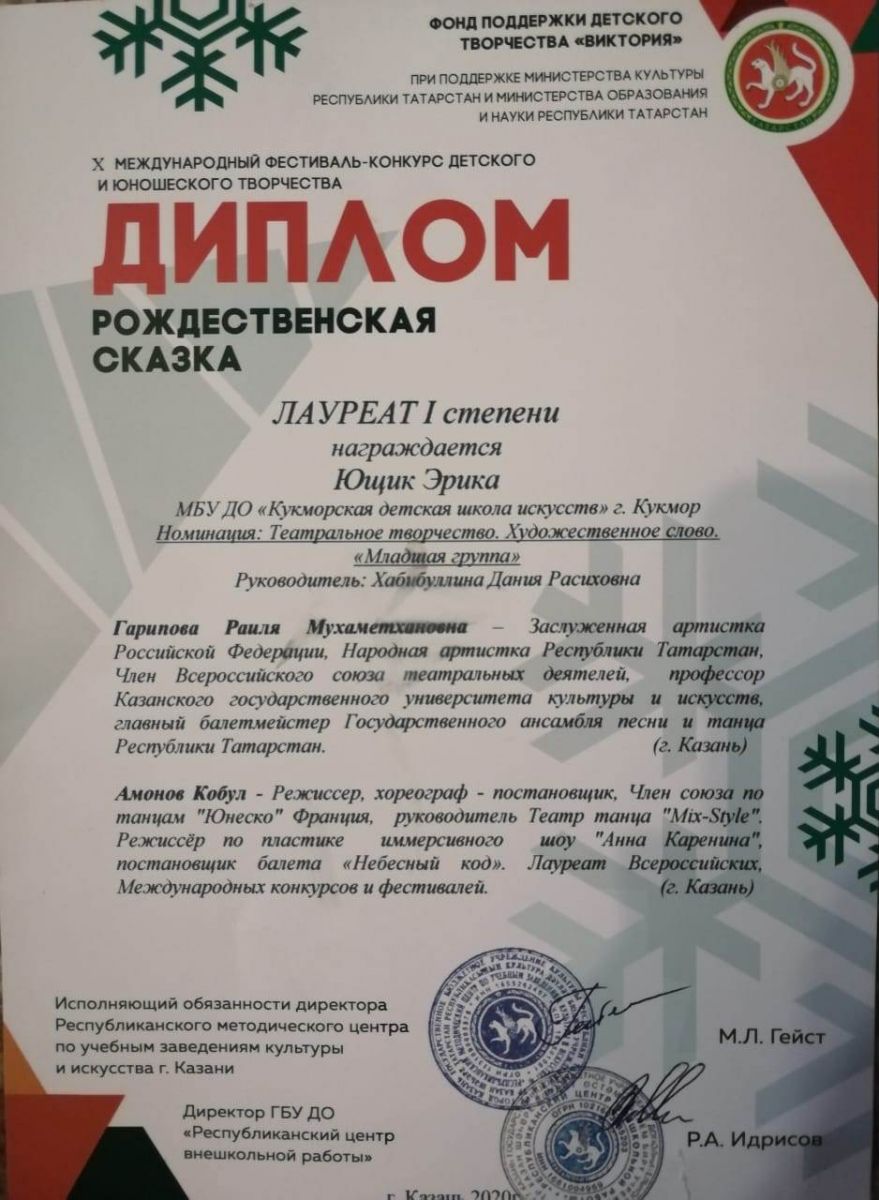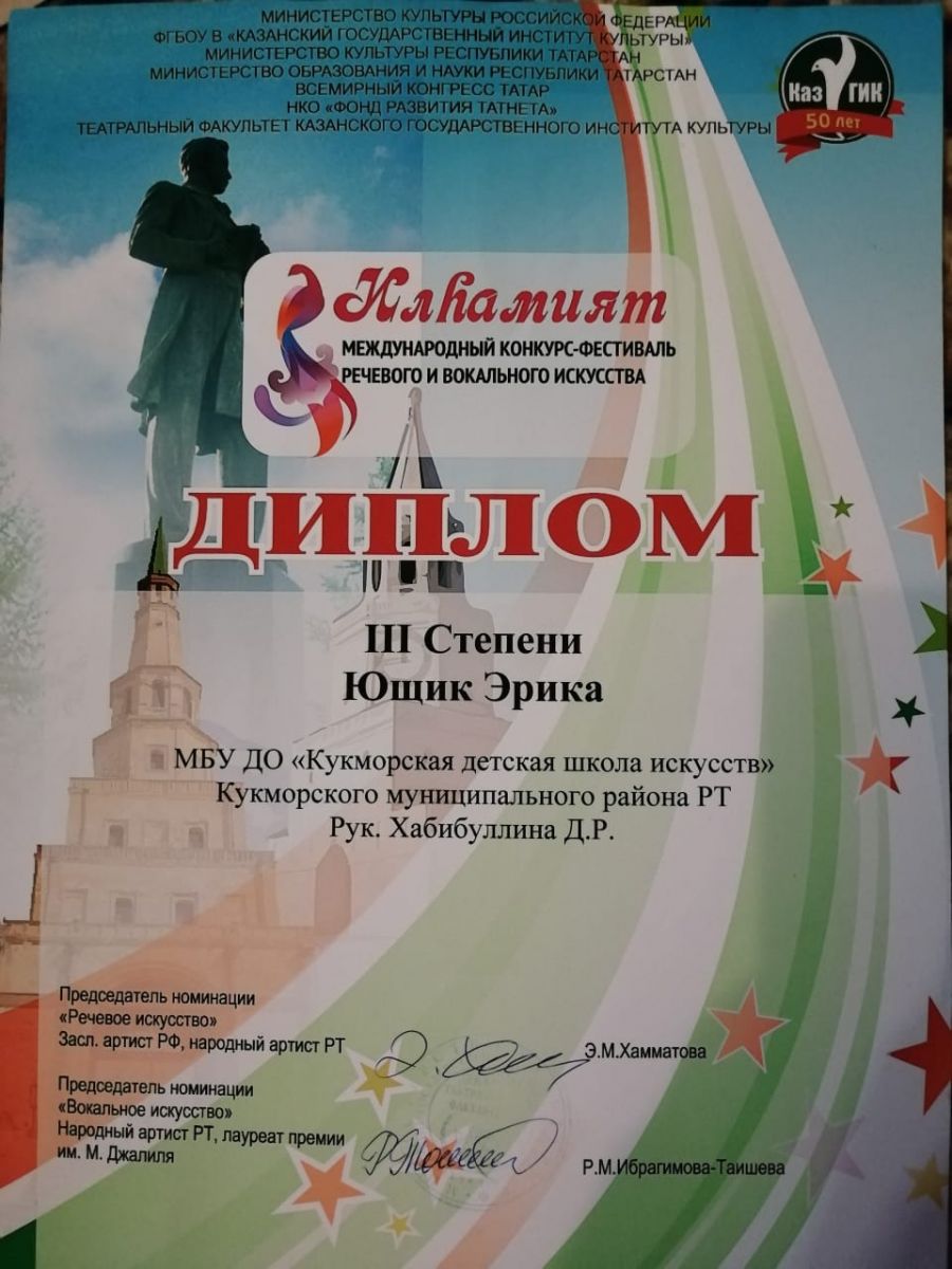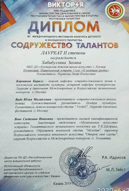 Гарифуллина Алия- Лауреат 1 степени; Гасимова Дина- Лауреат 1 степени; Рамазанова Карина- Лауреат 2 степени; Дуэт Хабибуллина Ислама и Ющик Эрики- Лауреат 3 степени; Миннегалиева Альфина- Лауреат 3 степени; |