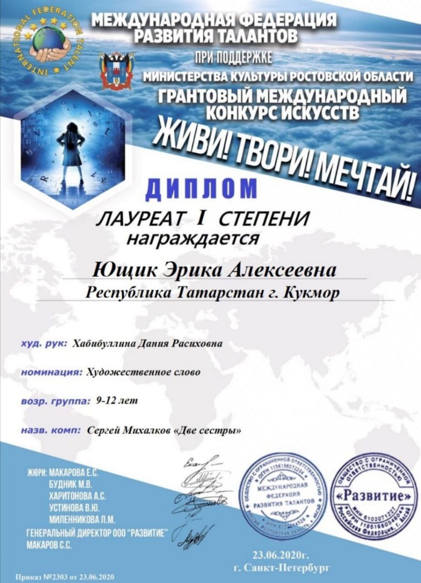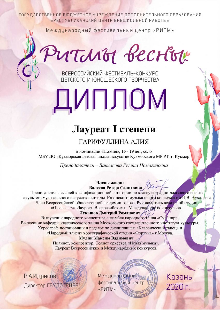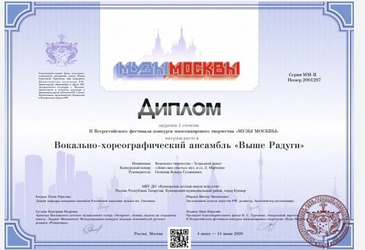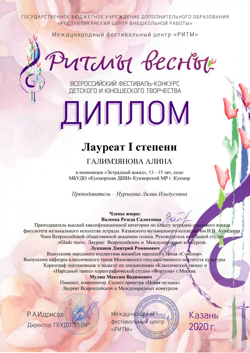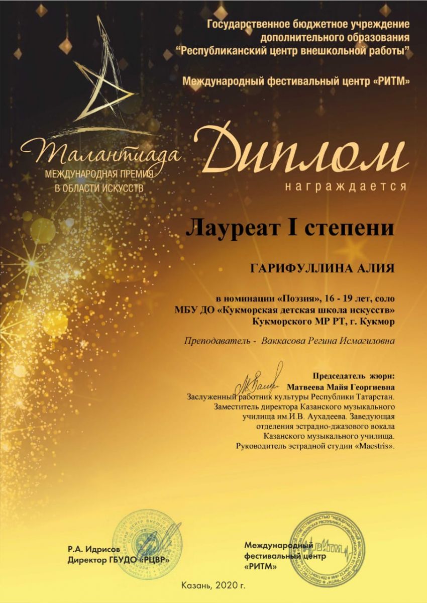 Гарифуллина Алия- Лауреат 1 степени; Гасимова Дина- Лауреат 1 степени; Рамазанова Карина- Лауреат 2 степени; Дуэт Хабибуллина Ислама и Ющик Эрики- Лауреат 3 степени; Миннегалиева Альфина- Лауреат 3 степени; |