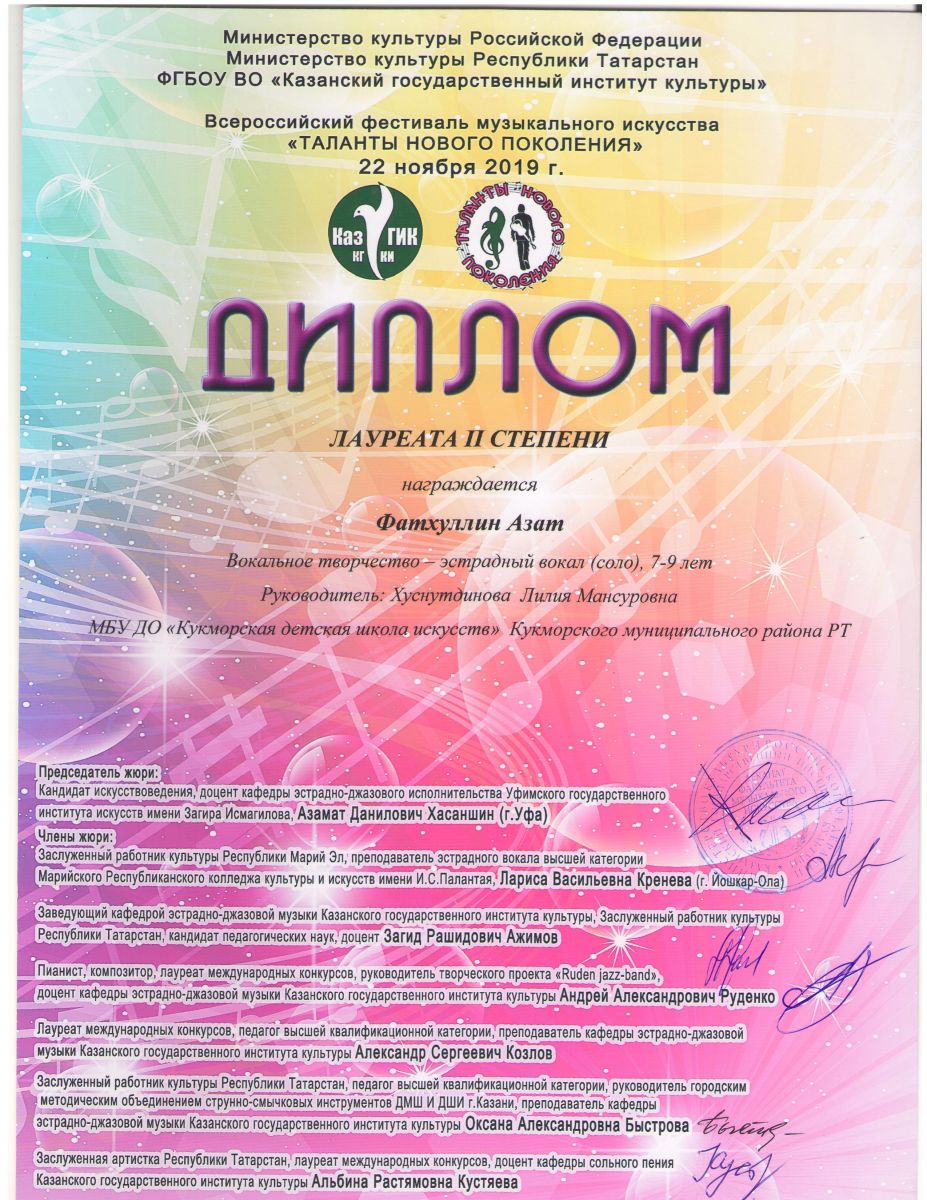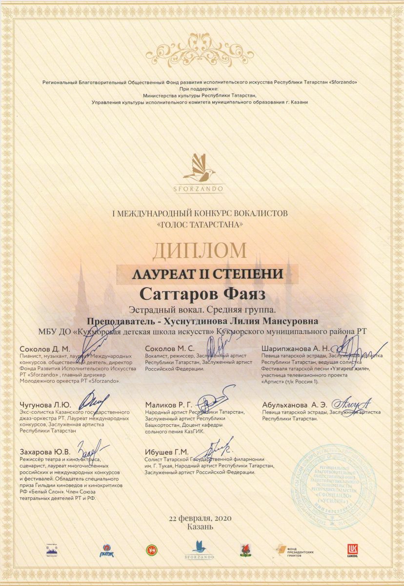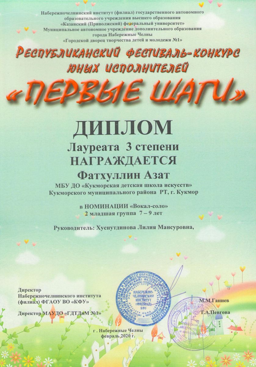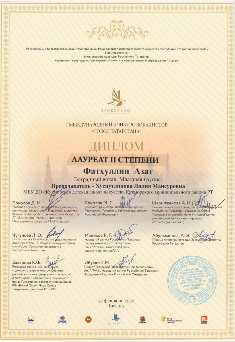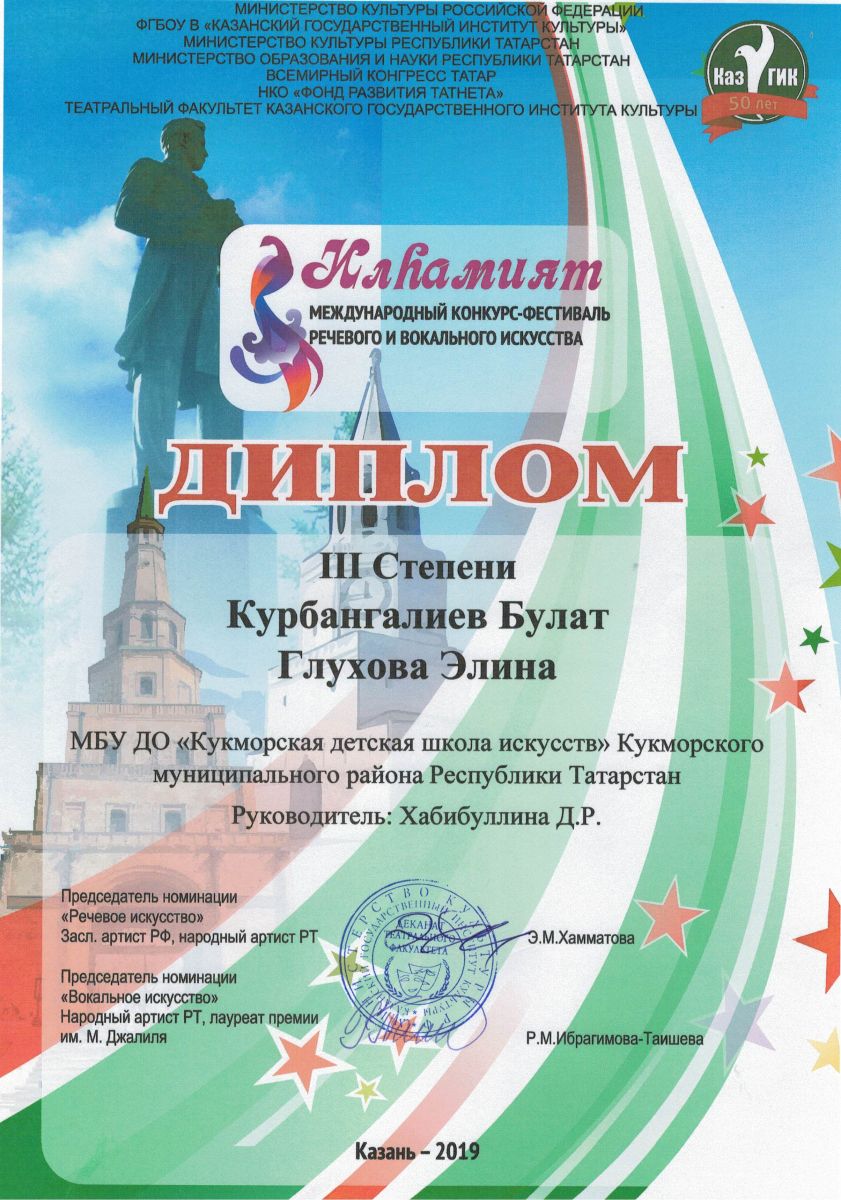 Дуэт Курбанагалиев Булат и Глухова Элина- Диплом 3 степени; Хабибуллин Ислам- Диплом 3 степени; Мубаракшина Сирина- Диплом 3 степени; Назипов Саид- Диплом 3 степени; Фатхуллин Азат- Лауреат 3 степени; |