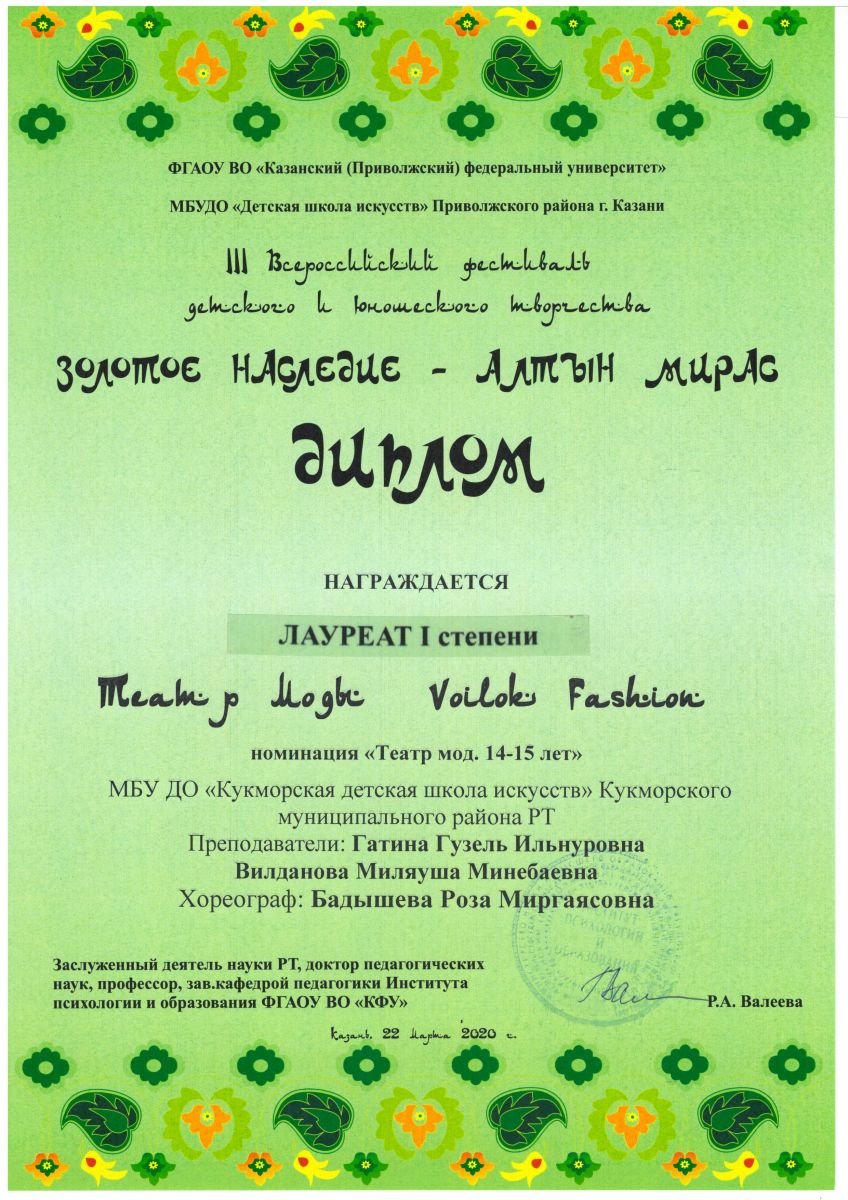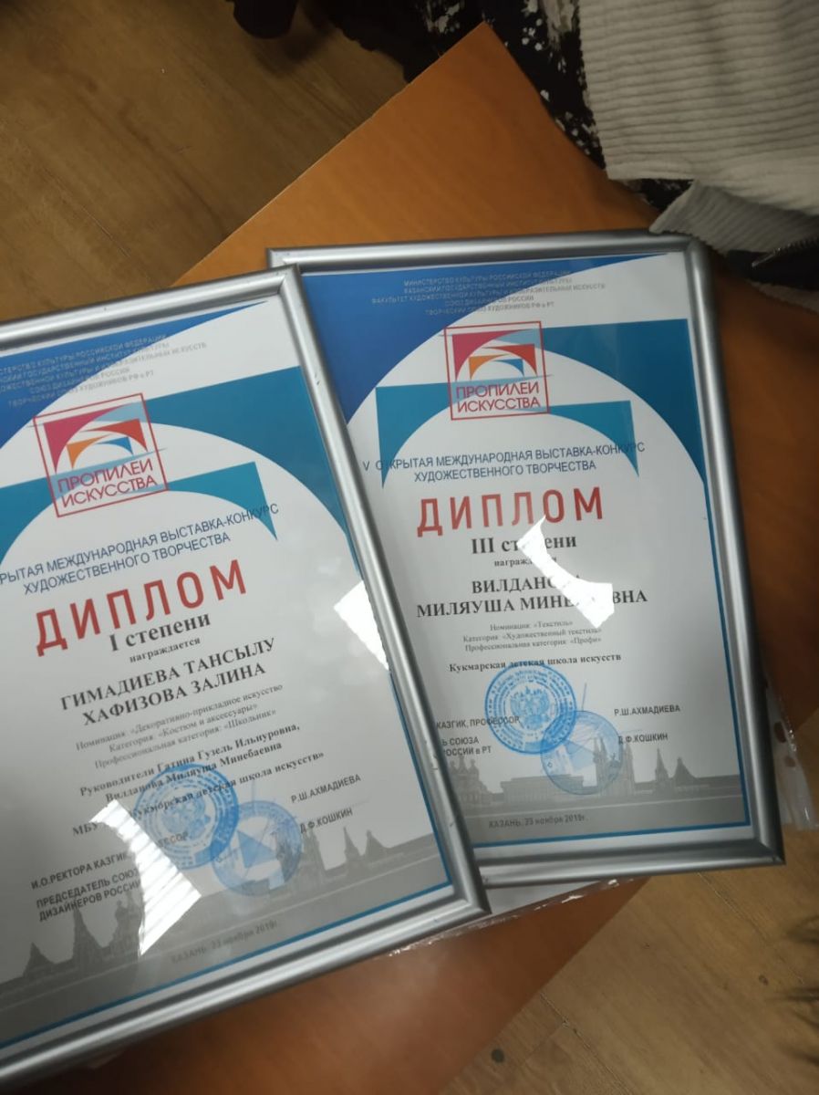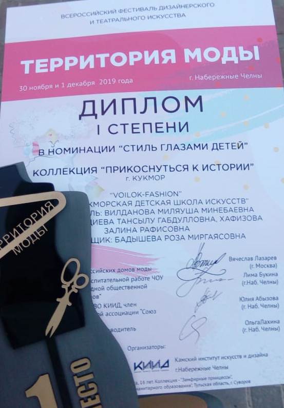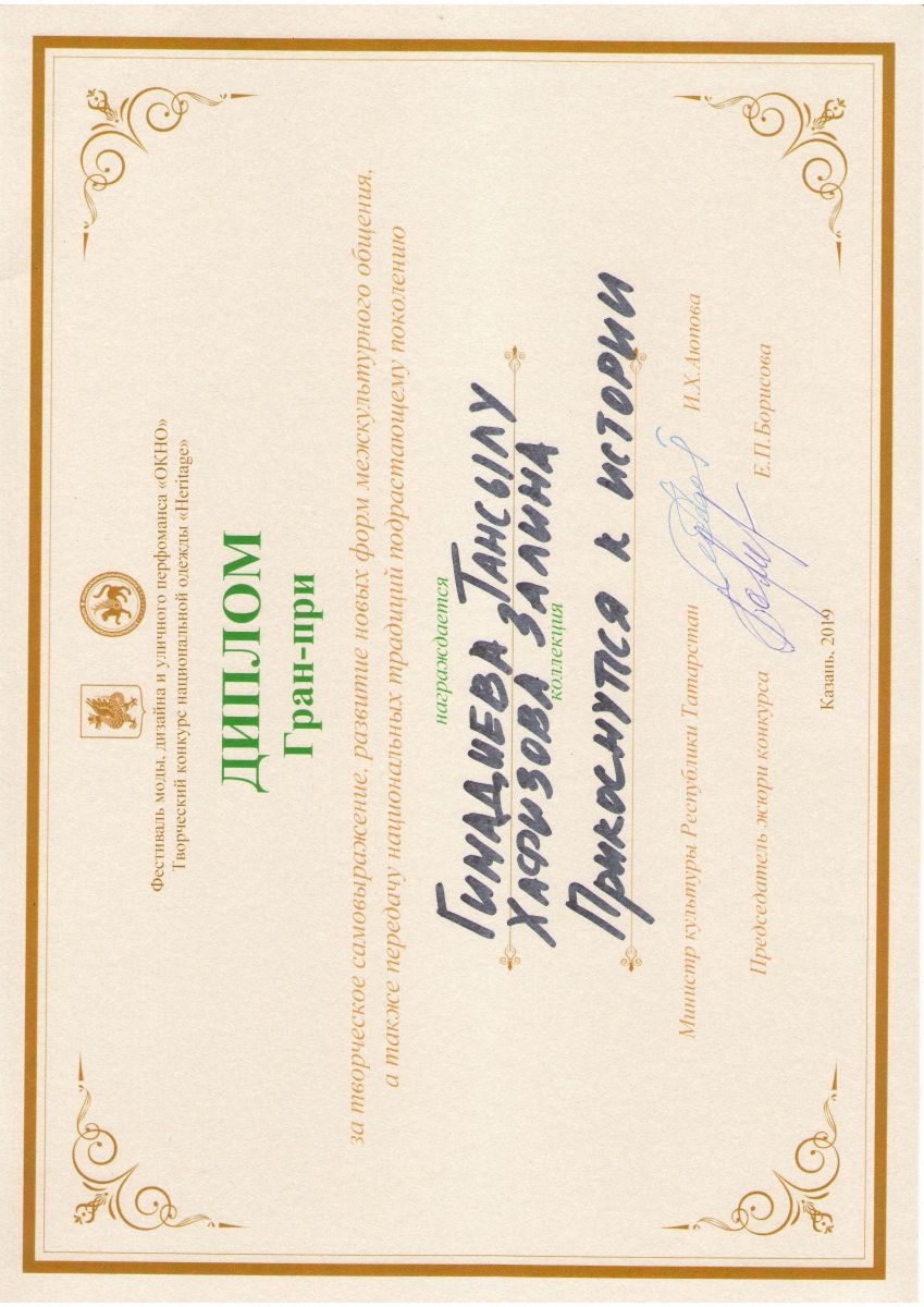 1.Камалиева Аделия, Сафина Лилия- Коллекция «В ритме этно»- Диплом Лауреата 3 степени; 2.Гатина Г. И., Исхакова Г.Р- Коллекция «Этно стиль»- Диплом Лауреата 3 степени; 4.Хафизова Залина и Гимадиева Тансылу – Коллекция «Прикоаснуться к истории»- ГРАН- ПРИ |