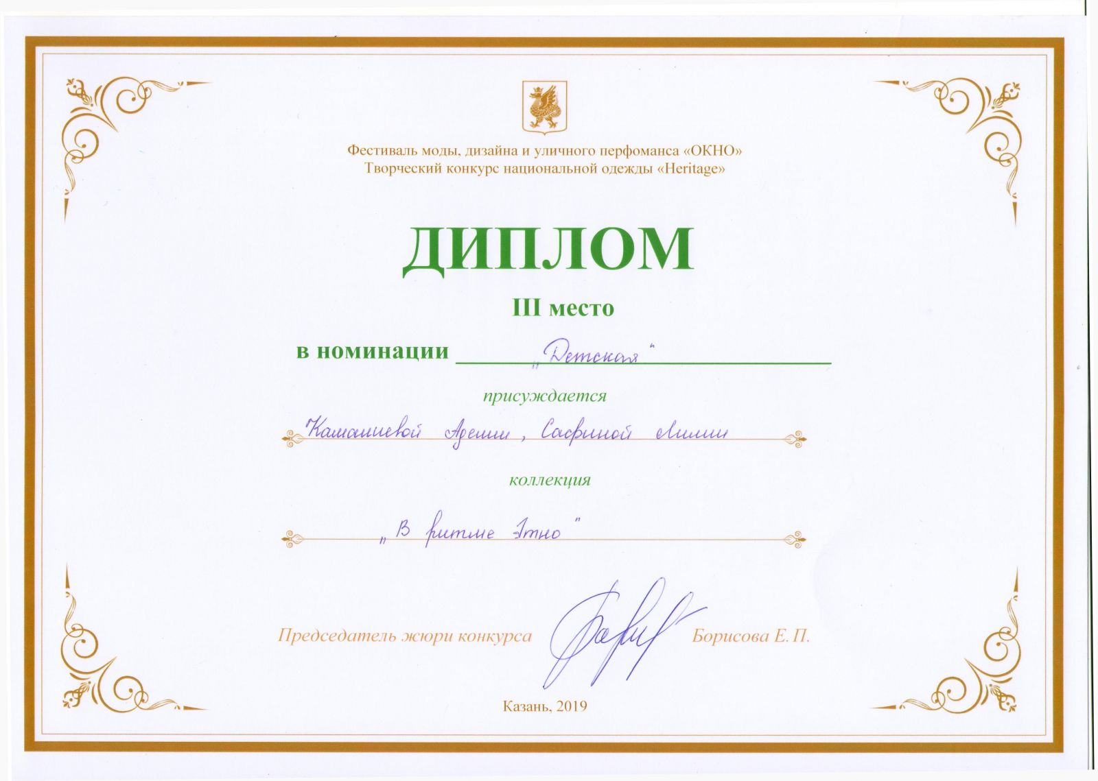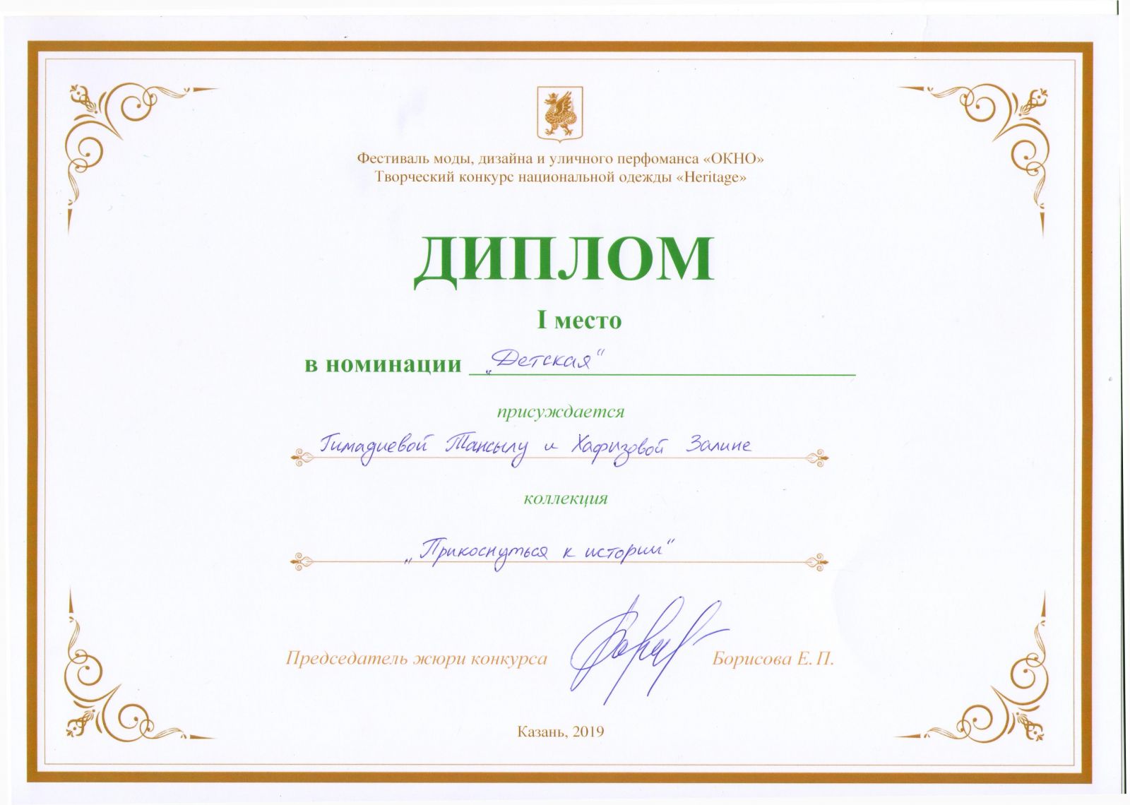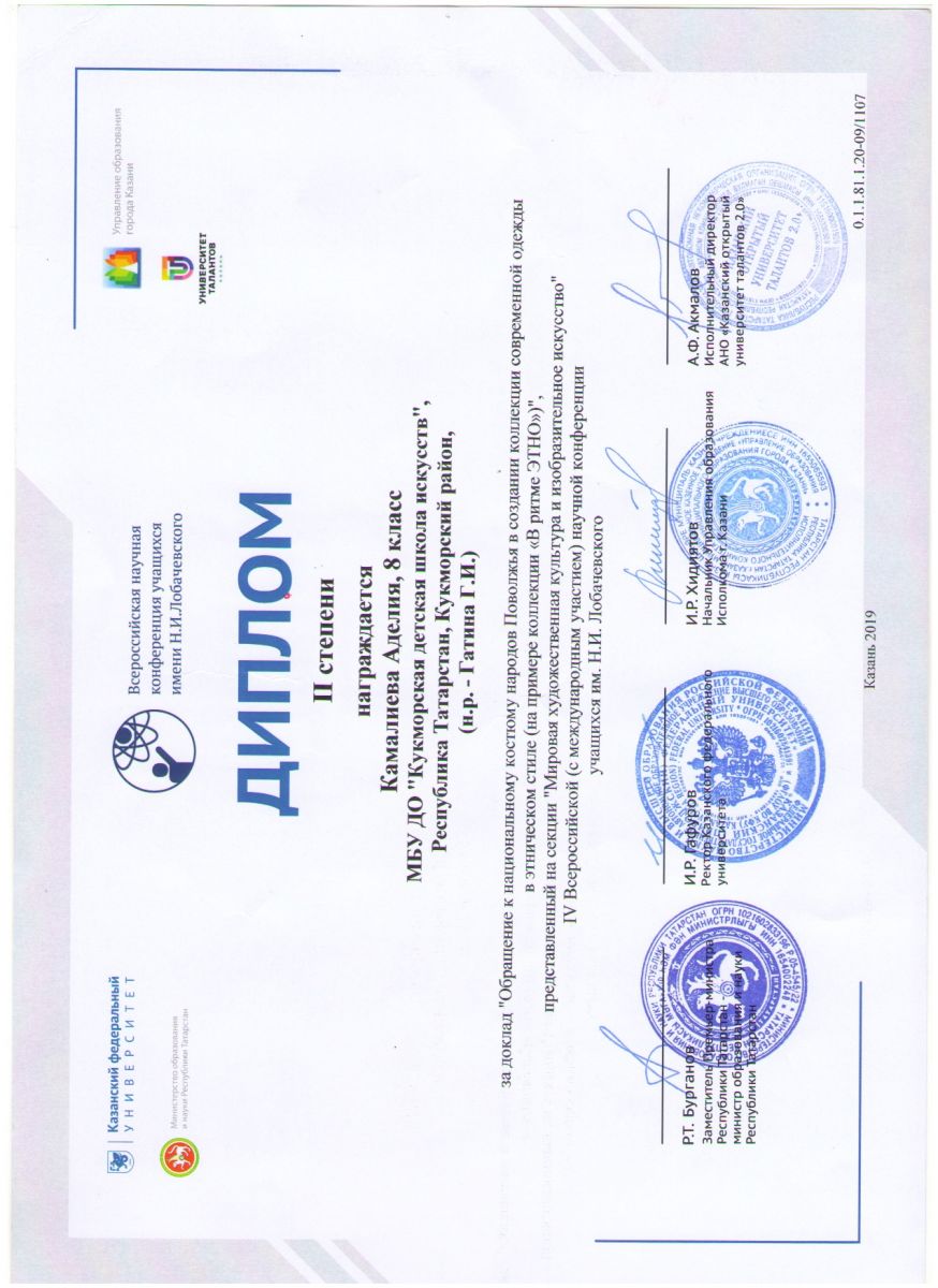 1.Камалиева Аделия, Сафина Лилия- Коллекция «В ритме этно»- Диплом Лауреата 3 степени; 2.Гатина Г. И., Исхакова Г.Р- Коллекция «Этно стиль»- Диплом Лауреата 3 степени; 4.Хафизова Залина и Гимадиева Тансылу – Коллекция «Прикоаснуться к истории»- ГРАН- ПРИ |