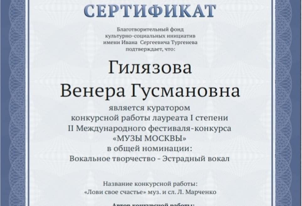 - Гилязова В.Г. – Сертификат Благотворительного фонда социально-культурных инициатив имени И.С. Тургенева- о том, что является куратором конкурсной работы Всероссийского фестиваля- конкурса многожанрового творчества «Музы Москвы»