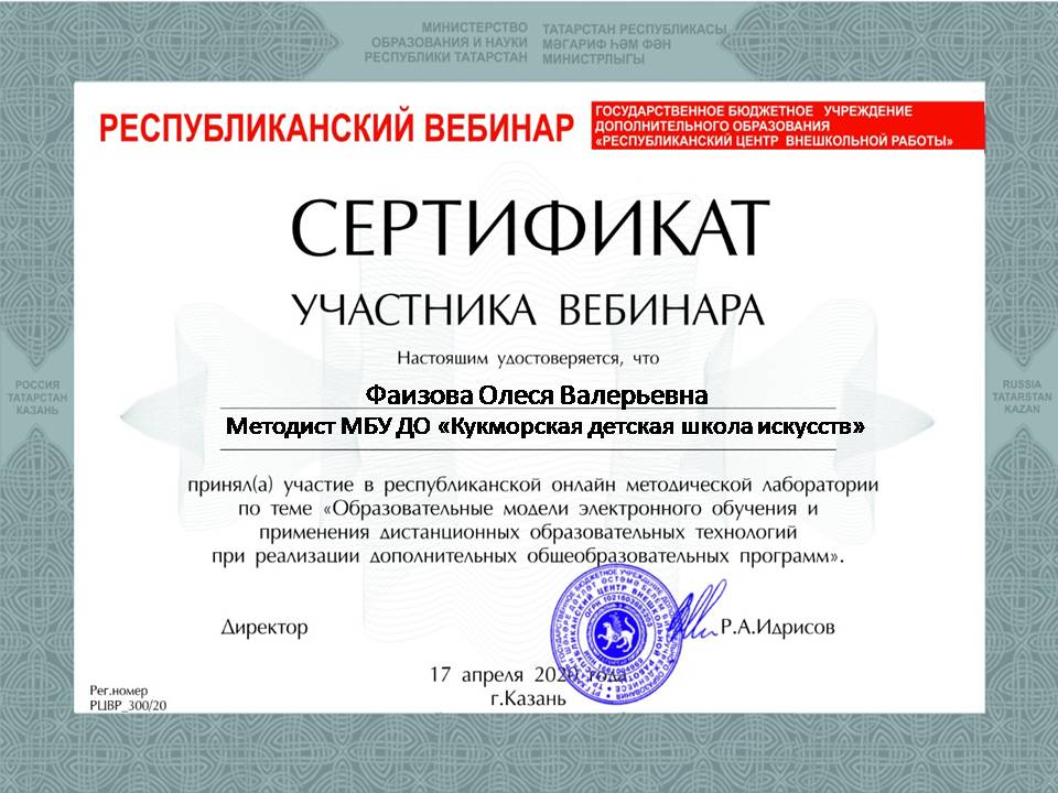 - Фаизова О.В.- Участие в республиканской онлайн методической лаборатории «Образовательные модели ЭО и применения ДОТ при реализации дополнительных общеразвивающих программ »;