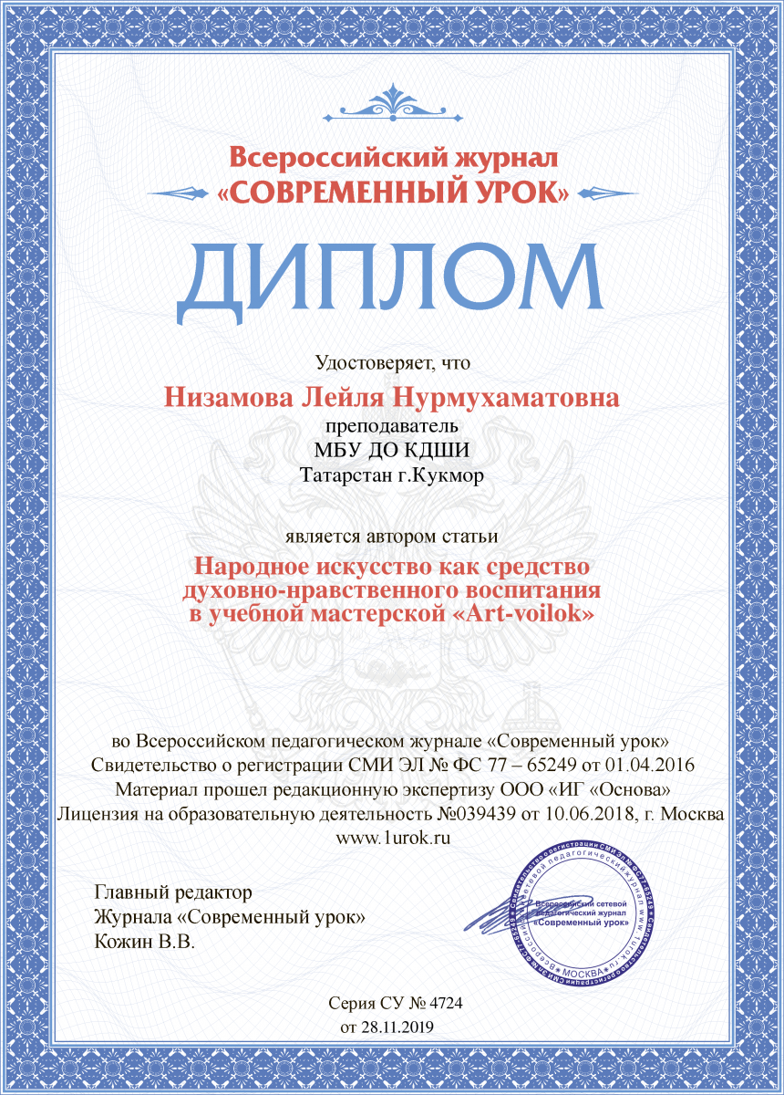 6. Низамова Л.Н.- Публикация во Всероссийском педагогическом журнале «Современный урок», статья «Народное искусство как средство духовно- нравственного воспитания в учебной мастерской Арт- Войлок»;