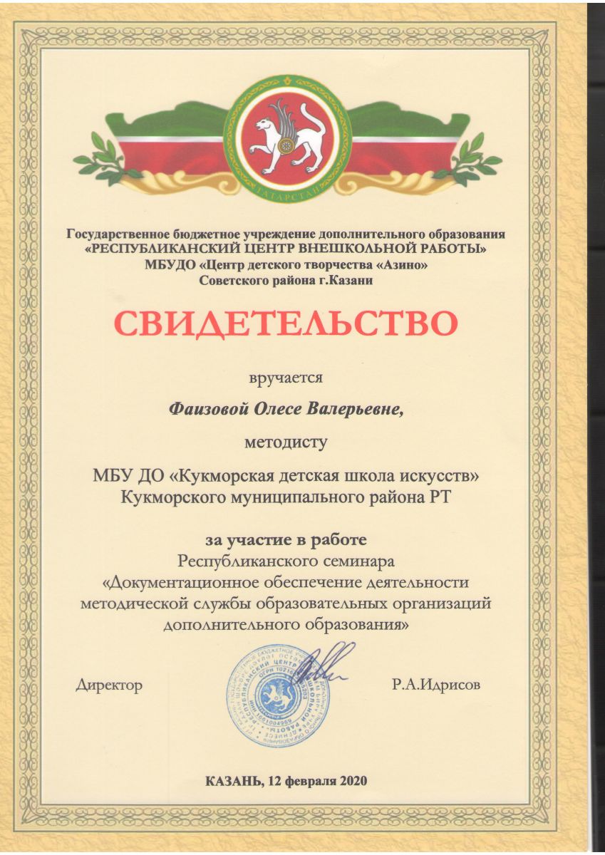 - Фаизова О.В.- Участие в республиканском семинаре «Документационное обеспечение деятельности методической службы ОО ДО», ГБУ ДО «РЦВР»;