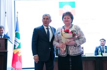 Президент Республики Татрастан Рустам Нургалиевич Миннеханов наградил директора МБОУ «Многопрофильный лицей им. А.М. Булатова г. Кукмор» Камалову Любовь Степановну на итоговой сессии Кукморского муниципального района медалью "За доблестный труд". / Татарстан Республикасы Президенты Рөстәм Нургали улы Миңнеханов Кукмара муниципаль районы йомгаклау сессиясендә Кукмара шәһәре А.М. Булатов исемендәге күппрофильле лицей директорын Камалова Любовь Степан кызын "Фидакарь хезмәт өчен" медале белән бүләкләде.