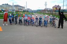 Сегодня на территории нашего детского сада прошла самая настоящая велогонка. На велосипедах из мультфильма к нам приехали Маша и медведь. С детьми они соревновались на велосипедах, но нарушили правила движения. Пришлось детям научить наших гостей правильно ездить на велосипеде, соблюдая все правила дорожного движения.