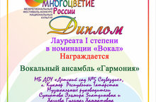 Подведены итоги Межрегионального фестиваля-конкурса национальных культур "Радужное многоцветие России". Коллетив детского сада (вокальный ансамбль "Гармония")участвовал в номинации "Вокал" и стал лауреатом 1 степени. Педагоги участвовали также в номинации "Декоративно-прикладное творчество и народные художественные ремесла и промыслы" и стали обладателями дипломов: