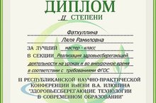 Поздравляем инструктора по ФК Фатхуллину Лялю Рамиловну, показавшую лучший мастер-класс во II Республиканской научно-практической конфереции им.В.А.Илюшина "Здоровьесберегающие технологии в современном образовании".