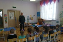 Сегодня в нашем саду состоялась встреча со старшим инспектором Государственного пожарного надзора Каримуллиным Ф.Ф. Он провел беседу с ребятами на тему: "Что вы знаете о пожаре и как себя вести при пожаре?"/ Бүген безнең бакчада Дәүләт янгын сүндерү күзәтчелегенең өлкән инспекторы Кәримуллин Ф.Ф. белән очрашу булды. Ул балалар белән "Янгын очракларында үз-үзенне ничек тотарга һәм янгын турында нәрсә беләсез?" дигән темага әнгәмә үткәрде.
