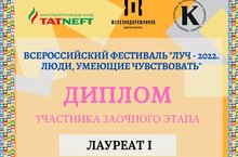Стали известны результаты заочного этапа Всероссийского фестиваля-конкурса интеграционного творчества «ЛУЧ – 2022. Люди, умеющие чувствовать», прошедшего в конце декабря 2022 года в г.Казань. Наши учащиеся Айгишева Ангелина, Галеева Ландыш, Васильев Максим в номинации "Музыкальное творчество" удостоились звания Лауреатов 1 степени!!! Поздравляем учащихся и преподавателей Шаймарданову З.К., Курочкину А.М. с победой!!!