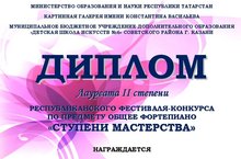 21 апрельдә Мәскәү шәһәрендә «Язгы илһам» Халыкара күпжанрлы конкурс-фестивале узды. "Классик инструменталь иҗат" номинациясендә фортепиано бүлеге укучысы Шәйдуллина Кәримә (ук.Шәймәрданова З.К.) "Классик инструменталь иҗат" номинациясендә 1 нче дәрәҗә Лауреат исеменә лаек булды! Котлыйбыз һәм алда иҗади уңышлар телибез! -